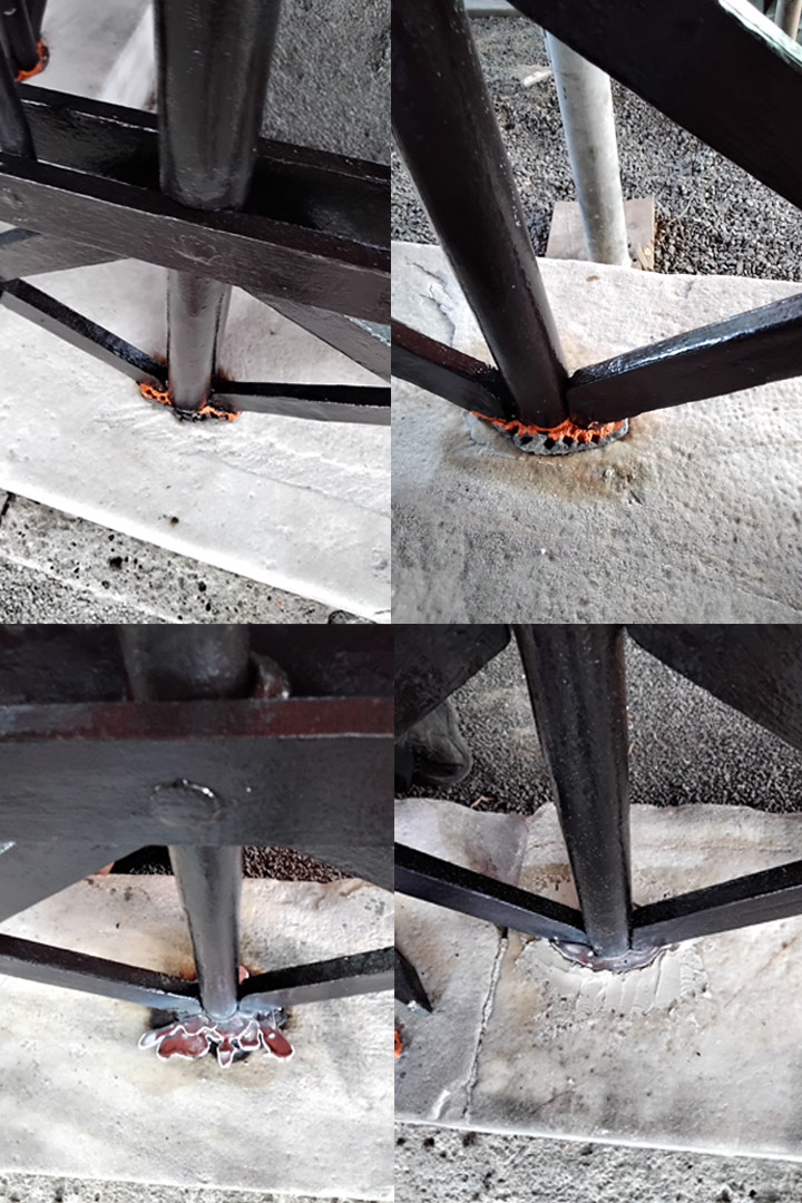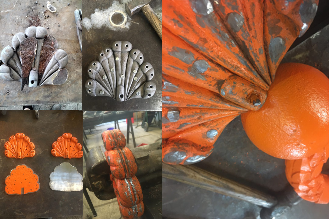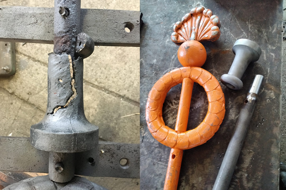 Das Schadensbild der Ornamentstäbe und Gusssockel und deren Restaurirung. Alle Ornamentstäbe waren von einer Rostsprengung des oberen Ornamentteils betroffen. Zur behebund, mussten alle Stäbe ausgebaut werden, die Pfauenfeder-Ornamente auseinandergenommen, die Innenseite für ein spaltenfreies Aufeinandernieten, nach der Reinigung, mit einer Bleilage versehen und im Anschluss alles neu Vernietetet werden. Bei der Sanierung der Guss-Sockel ergab das Schadensbild bei zwei Sockeln, eine Sprengung durch Korrision. Da diese bei einem Sockel so massiv waren, entschied man sich für eine Neuanfertigung an der Drehbank.