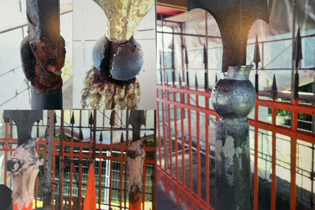 DAuch alle 64 Kugeln waren von massiven Korresionsschäden betroffen. Es musste eine Material-Alternative zu den bisher aufgenieteten bzw. aufgeschweißten Kugeln gefunden werden um den Wartungsaufwand zu minimieren. Man entschied sich für das Material Blei, da es auf den historischen Kontext zielt und als zulässiger Eingriff in die Bausubstanz gilt. Mehrere gußkokollen wurden anhand historischer Originale angefertigt. In zahlreichen Arbeitschritten wurden die neuen Kugeln direkt vor Ort an die Stäbe gegossen und ziseliert. Auch die Hauptsteher wurden an den Übergängen zum Steinsockel neu verbleit, da es in den über die Zeit entstandenen Kuhlen, durch stehendes Wasser zu Korrision an den Bauteilen kam.